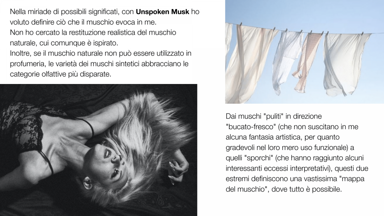 9. září bude uveden na trh parfém Unspoken Musk, nová vůně značky Francesca Bianchi. Emocionální pižmo, téměř vyvolávající fyzickou reakci, sladké, sametové, přesvědčivé, špinavé, květinové, lidské. Nevinné a hříšné zároveň. Pižmo představující dichotomii, která definuje lidskou bytost.