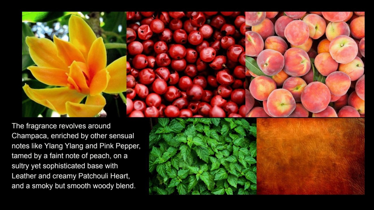Vůně se točí kolem Champacy, obohacené o další smyslné tóny, jako je Ylang Ylang a růžový pepř, zkrocené slabým tónem broskve, na dusném, a přesto sofistikovaném základu s kůží a krémovým srdcem Patchouli a kouřovou, ale hladkou dřevitou směsí.